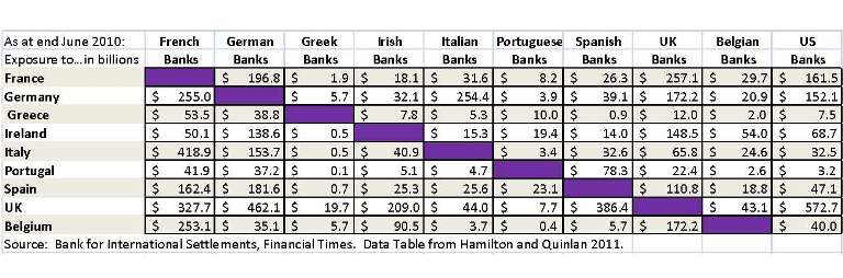 It’s a cautionary tale for Americans now. The U.S. seems finally to be digging out from its economic woes, and many people have the view that the euro is not part of their economic landscape and therefore they should not care one way or another about it. Yet the same instantaneous transmission mechanism–the interbank overnight lending market–is still active, and can carry chaos to the U.S. at any time. One change, however, is that this time we know where those problems are. Because better transparency and disclosure requirements have been implemented since 2007, we can identify which U.S. and European banks have what exposure to Greek sovereign euro debt. Fortunately, that number is relatively small ($7.5 billion). Unfortunately, in the age of interdependence, that’s not the end of the story as the graph below–taken from Hamilton and Quinlan’s The Transatlantic Economy 2011–makes clear. To understand the extent of U.S. banks’ exposure to Greek debt, one would have to include, for example, the large exposure that U.S. banks have to UK banks, and notice that UK banks have $12 billion exposure to Greek debt, and so forth. All told, most European banks have exposure to Greek debt, and if Greece were to default, many European banks would be at risk of being undercapitalized. This, in turn, would put pressure on U.S. banks with exposure to European banks, which hits all major banks. Thus, a Greek default would immediately–overnight–create a seizing up of the U.S. credit markets as all parties sorted out their credit risks and exposures.