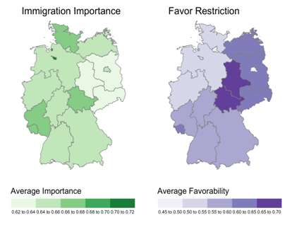 To answer these questions, I compare average immigration attitudes by federal state in the month proceeding the 2021 election. I find that despite reductions in immigration between 2017 and 2021, German voters across the country still believed it to be an important topic. Moreover, there are no statistically significant differences by state: immigration is perceived to be just as important in Saxony as it is in North Rhine-Westphalia. Still, contrary to issue importance, average preferences for immigration restrictions vary significantly across the country. The German electorate on average leaned slightly toward restricting immigration, with clear regional variation between former East and West Germany. These simple aggregate patterns suggest immigration remained important in the 2021 Bundestag election beyond mere issue salience.