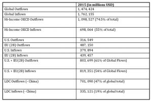 Although foreign direct investment (FDI) is widely viewed as an important potential source of economic development, very little FDI flows toward the developing world. According to the United Nations, in 2015 there were nearly $3 trillion worth of foreign direct investment flows globally. Unfortunately, the lion’s share of those flows are between wealthy OECD countries, accounting for more than 70 percent of all outflows and more than 50 percent of all inflows (see Table 1).